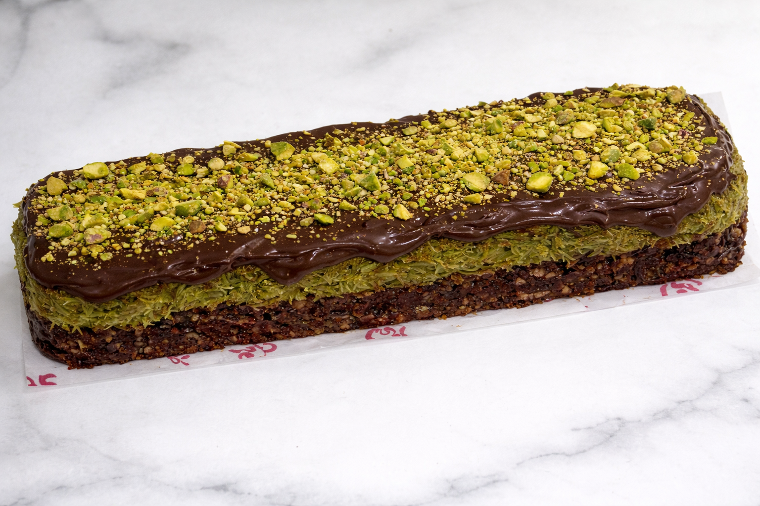 A signature layered cake-sized bar made of a chocolate date foundation, a heart of pistachio butter and golden shredded phyllo, crowned with dark chocolate and hand-finished pistachio crumbles. (serves 8 to 10 persons)